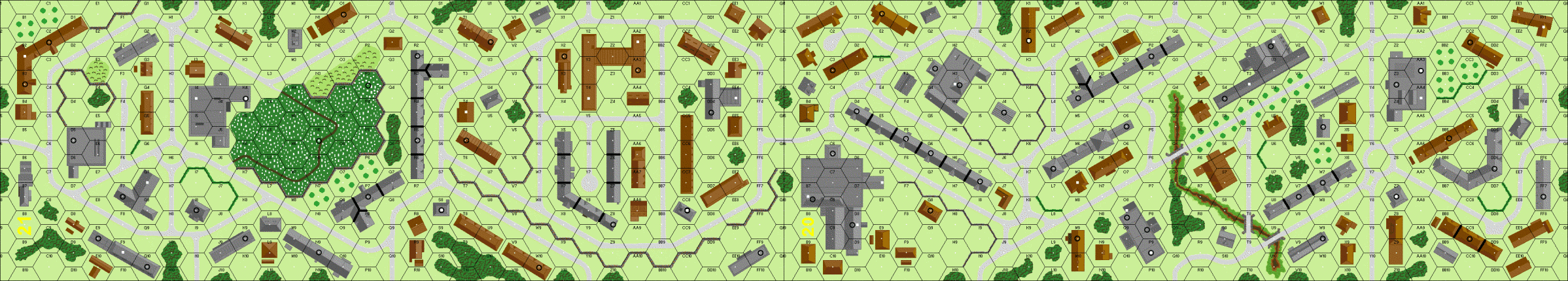 As the defending Germans I left two squads offboard thinking that as good balance. I set my roadblock at 21R1/S2, HMG on 2nd floor of 21K4 and AT guns at 21H0 & 21H10. I placed my other units mostly around on the potential exit hexes 20I1, 20I10, 21Y1 and 21Y10. My opponent played it rather conservatively in the first turns keeping the infantry with the tanks (note T-70 is tankette, so no raiders, even if picture on the Scenario Archive shows T-70 with raiders). This suited me fine as I did not have any of my units far out as an advance guard.