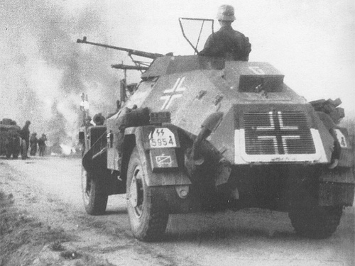 Walter Toebbens, a leading German industrialist and major “employer” of the “productive Jews” of Warsaw, was brought from Berlin to solve the Nazis’ difficulties by “peaceful means”. He was to convince the Jewish civic and religious leaders to surrender their followers for “re-settlement”. Instead, Toebbens decided to take the opportunity to move his shops – lock, stock and workers – out of the doomed Ghetto. Appeals and lies brought about 250 of his 1600 laborers to the site of the Schultz & Schilling Brush Works on Shwentoyerska Street. Here they, along with the tools and goods of the factory, were loaded onto a convoy of trucks. Near noon, the convoy moved off, with a single aged armored car in the lead, under the guard of the despised Vernichtung – anti-Semetic Latvian, Lithuanian and Ukrainian volunteers under SS command. The trucks were bound by a circuitous route for the rail station at Umschlagplatz. Within minutes, however, a commando from the Paole Zion group ambushed the convoy.Attacker: German (SS) (Vernichtung Bataillon, Warsaw)