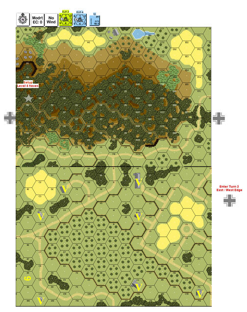 | Misc Rules: | Bldgs: Stone, Hedges and Walls: Bocage (B9.5). Hill Woods are two-level obstacles, cost 4MP |