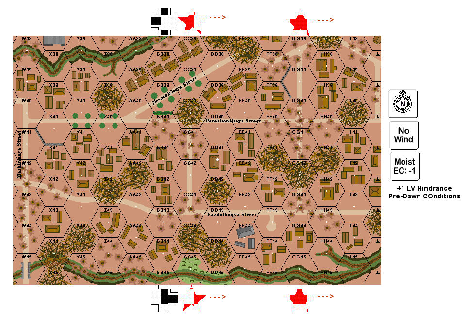 Although desperate to buy time to allow the 45th Division to be ferried across the Volga at night, the Russians had no more reserves. During the 27th, the shattered 118th Rifle Regiment had a bit of luck. To their surprise, they recovered three tanks from the front lines, one with a functional flamethrower. Anxious to buy time and spread their newfound joy, the Russians threw together these tanks and sent this hastily formed armored reserve to counterattack. Supported by artillery and katyusha batteries, the Russians launched their attack in the pre-dawn twilight. . .Attacker: Russian (118th Rifle Regiment/62nd Army Staff and 118th Rifle Regimental Headquarters)