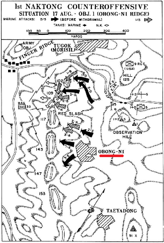 Early in the morning of 17 August, elements of the 5th Marine Regiment had fought a series of platoon and company sized actions against portions of the 4th NKPA Division. The fighting took place along the crest of a brush covered ridge known as Obong-Ni. Late in the afternoon of the 17th, the northern-most peak was occupied by Company B, 15th Marines after taking heavy casualties. Company F of the U.S. 9th Infantry occupied another ridge just north of Obong-Ni. The North Korean response was prompt; using the support of a few T-34 tanks, an attempt at an encircling maneuver was made around the north end of Obong-Ni was made, using a dry, dusty road that ran between the Army and Marine regiments. Directly in their path lay the remaining Leathernecks of Company B, and its attached AT company from the 5th Marines.Attacker: North Korean (Elements 4th, NKPA Division)