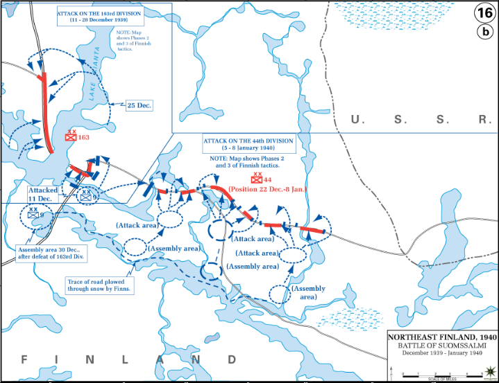 Following an easy crossing into Finland, the 163rd Ukrainian Divison was stopped at Suomussalmi. The unit lay immobile, stretched out for miles along the narrow road leading into the small village. The Finnish 27th Regiment was tasked to surround and cut off the enemy, in the process breaking the road-bound columns up into smaller encirclements known as mottis. To accomplish the mission, the Finns carved out a parallel ice road and used it to array the attacking units. On December 12th, the first road-cutting assault came, cutting through surprised enemy troops just east of Suomussalmi. Russians in the village were cut off from the rest of the division, while other piled toward outlying buildings. A first probe in Suomussalmi was stymied but a second attempt was made on the 14th.Attacker: Finnish (Elements of 27 Jäger Regiment, 9th Finnish Division)