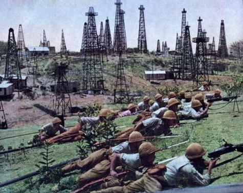Japanese soldiers in a captured oil field in the Dutch East Indies
