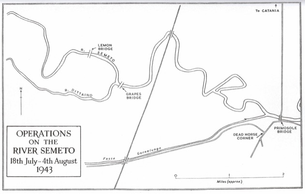 The end of July was a dismal time for the Eighth Army as Montgomery’s strategy became unglued. As the Germans delayed the British at the Catania plain, they were able to establish their defenses along the Etna Line. Montgomery devised the notion of throwing a left hook around the Germans. At the time the 50th Division held the Primosole Bridgehead but had not been able to expand from it. The 5th Division was tasked with penetrating the Simento River north of the bridgehead. The 13th Brigade was ordered to establish a bridgehead north of an unnamed bridge some 6 miles west of Primosole. Dubbed Lemon Bridge by the British, this became the site of a series of fierce battles between the British and Group Schmalz.Attacker: British (2nd Inniskillings Regt, 13th Brigade, 5th Infantry Division)