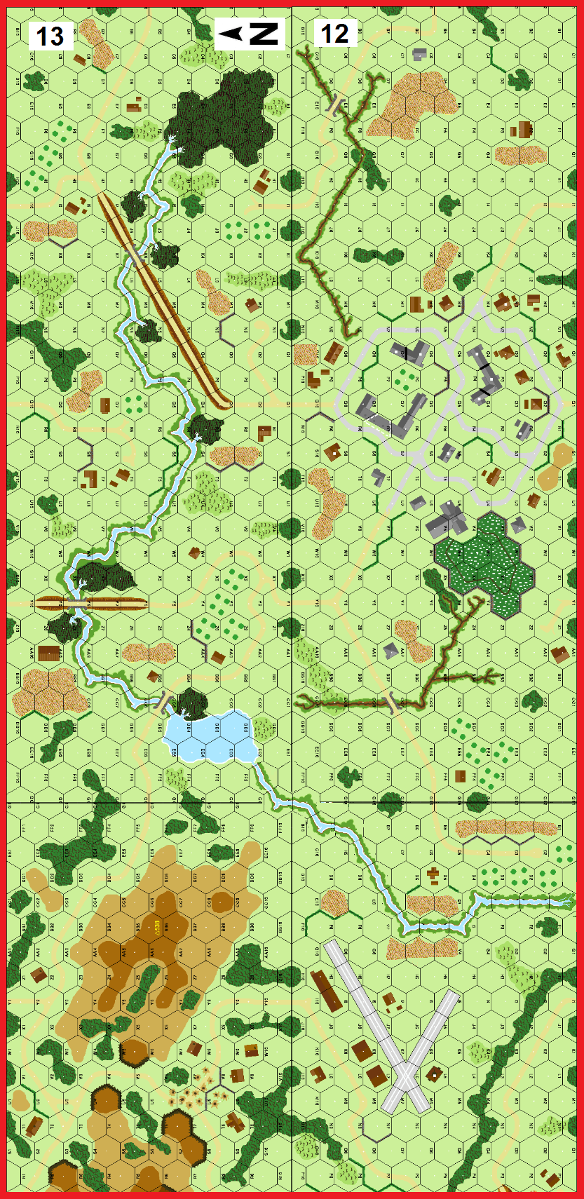 | Misc Rules: | Gullies contain Mud and subject to Bog. A: AE/Sappers, Air Support w D: AFV take Out-of-Gas checks |