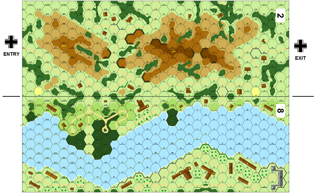 | Misc Rules: | No shellholes. Bd 8 - No hills Level 1 is Brush Level 2 is Marsh A: Convoy (E11) |