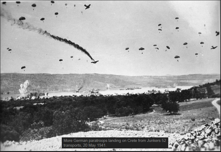 "Dropping Off At Maleme?" -- The previous day, at the beginning of Operation Merkur, the Luftelande-Sturmregiment underwent heavy losses from the 22nd New Zealand Battalion while attempting to seize the Maleme airport. In spit of its failure, the Luftelande-Sturmregiment was the unit which seemed to have established the most promising bridgehead. It confirmed that judgment on May 21 while seizing Hill 107 which overlooked the airfield in the south. Paratroops of Fallschirmjager Regiments 1 and 2 were en route to reinforce at 1430 hours and landed under the protection of a group of Junker 87.Attacker: German (Luftlande-Sturm Regiment, Bataillon 1, 4th Company of 3rd Bataillon/4th and 123rd Companies, Fallschirmjäger Regiment 2)