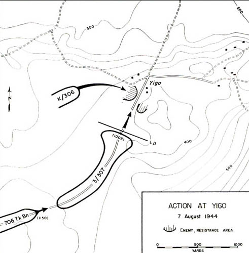 "Last Stop Before Victory" -- The conquest of Guam was nearing its end. Pursued by American forces, the Japanese were withdrawing toward the northeast. Yigo, the last strongpoint before beginning the clean-up phase, remained to be taken. The objective was the occupation of Yigo as well as the heights which dominated it to the east and north. The attack was to take place immediately after a bombardment of the village, but the narrow road in the assembly area created traffic jams and it was some 15 minutes after the end of the artillery preparation when light tanks finally launched themselves into a less-congested area extending south of the village. The light tanks rapidly came under intense machinegun fire coming from entrenchments and from pillboxes along the length of the right side of the road. The M5’s crashed through these positions and continued towards Yigo, leaving their reduction to the medium tanks and infantry.Attacker: American (C and D Companies, 706th Tank Battalion/K Company, 306th Infantry Regiment/3rd Batt., 307th Infantry Regiment/77th Infantry Division)