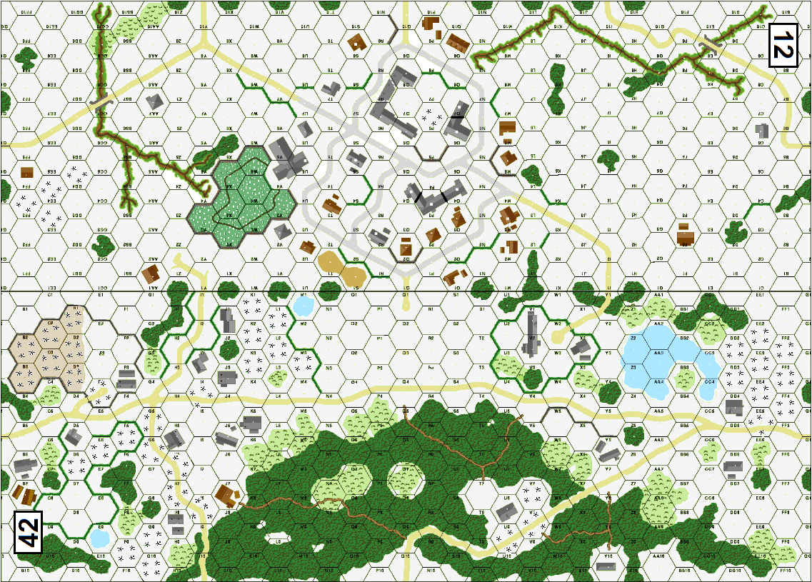 "A Foot Against" - - - As with other German units engaged in the Ardennes offensive, the 7th Army achieved none of its goals. However, it did try to hold some of its gains to the south to face the American reinforcements arriving from Patton’s 3rd Army. The divisions of the US III Corps face strengthening resistance from 22nd December, when they sought to recapture the town of Wiltz and hence relieve Bastogne. The wooded terrain and snow favored the defenders, which also prepared their own attack with the support of the Fuhrer Grenadier Brigade. This mobile unit, formed from the depots of the Grossdeutschland Division, was the only mechanized unit of the 7th Army. On 24th December, it launched its attacks on the towns of Eschdorf and Heiderscheid in company with the 79th Volksgrenadier Division. While fighting continued at the former, Heiderscheid was occupied by the US 80th Infantry Division and was directly targeted by the Germans. - - - Victory conditions: The German player must control at least 6 buildings between 12M and 12V inclusive (multi-hex buildings count double) while inflicting more CVP than has been suffered. The US player has already suffered 6 CVP at start of scenario.Attacker: German (Reinforced elements Fuhrer Grenadier Brigade)