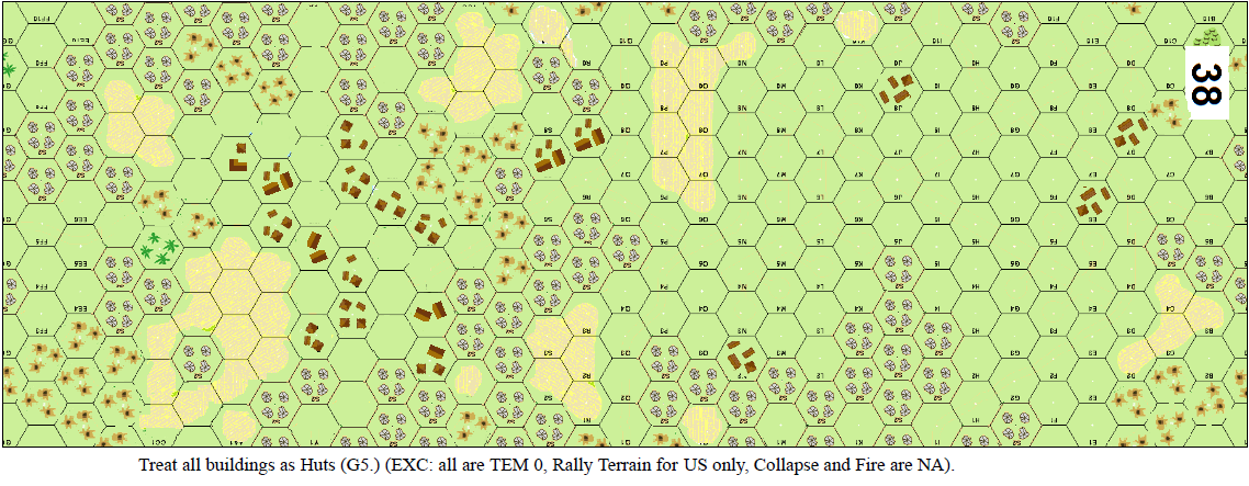 | Misc Rules: | Night (E1): T1-2, LV (E3.1): Like Heavy Rain, T3-4, Crags, Sand. A: AS (A19.131), but no Straying |