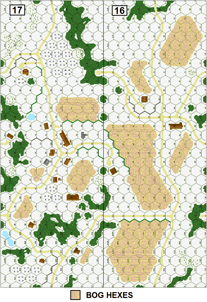 | Misc Rules: | DS (E3.73), FS (E3.71) All roads plowed, Bog areas +2 DRM. D: FB (B23.9), AT Ditch (B27.56) |