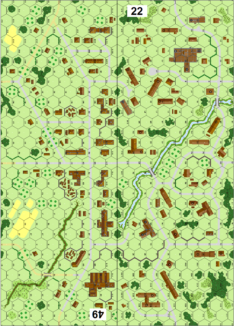 | Misc Rules: | HtH (J2.31) both sides. All Bldgs: Wooden and ground level only. Stream is Deep. |