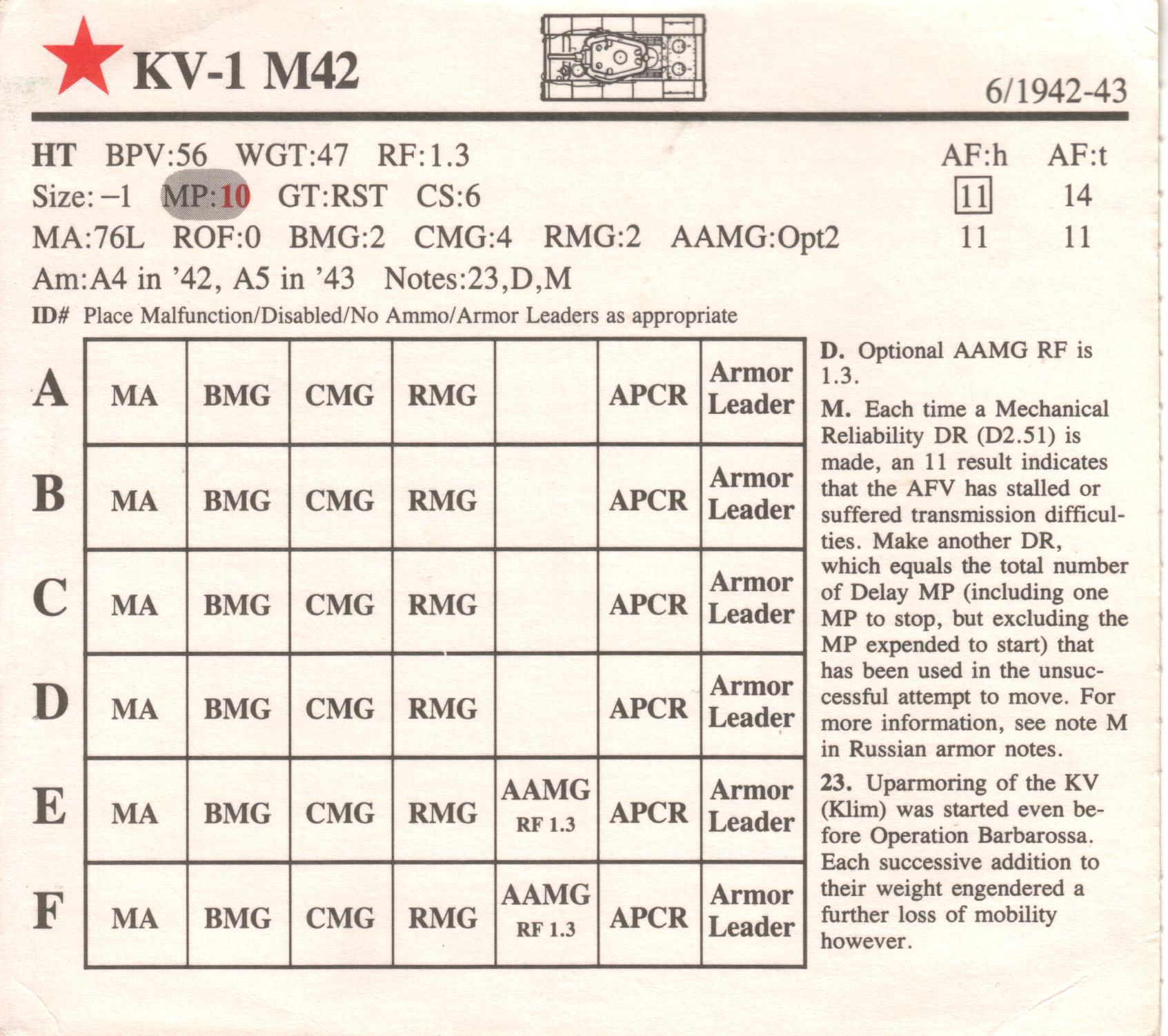| AFVs: D:10 T-34 M43 x 4 KV-1E x 2 KV-1 M42 KV-1 M41 T-34 M41 KV-1S GAZ-MM x 6 |