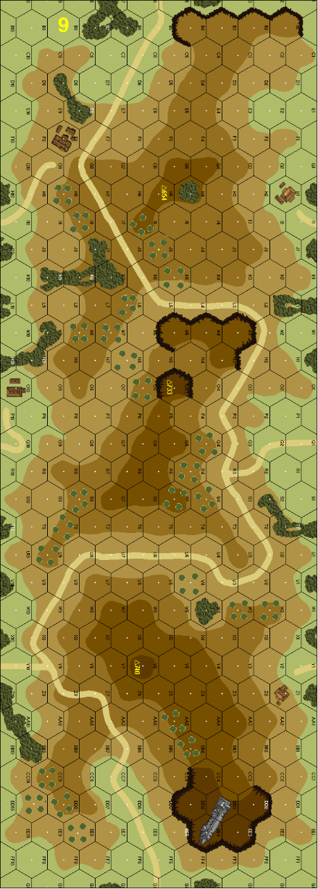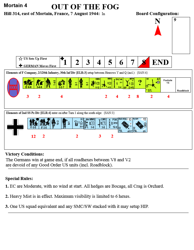 | Misc Rules: | BC, Heavy Mist (6 hex max view), Crags are Orchards |