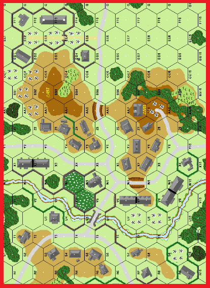 | Misc Rules: | Soft Ground (KGP SSR 5) in effect. Stream frigid and flooded. D: Tankdozer HIP if setup in building |