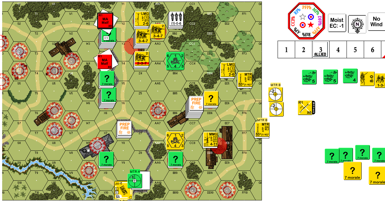Our playthrough, start of Turn 3. Indonesian malfed both tank MA. Japanese attacking from top of map.