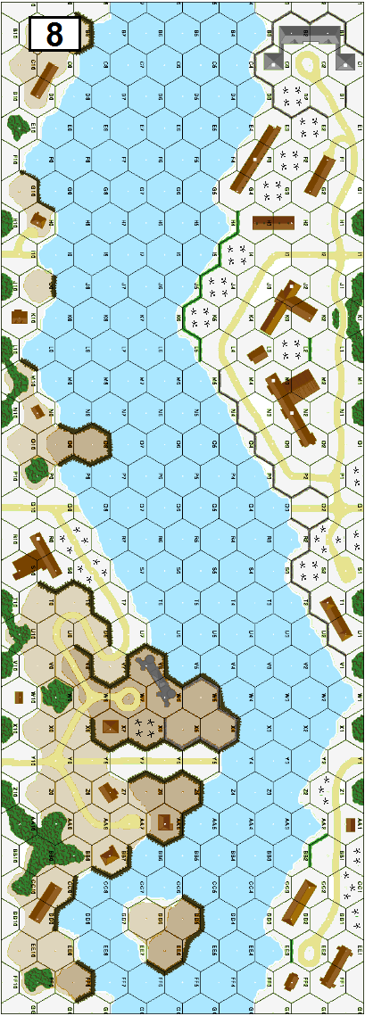 SOLITAIRE ASL - Wiking Division moved back to the Mius with some difficulty. The Soviets were not willing to wait and managed to get across the frozen Mius near Russkoje and at the Slovak held sector around Golodajevka. Steiner scrambled a Kampfgruppe from parts of his Engineer Battalion, 15th Company of Nordland Regiment and some Wehrmacht Panzers. The desperate Germans managed to push the Soviets back over the river.Attacker: German (SS) (No more details)