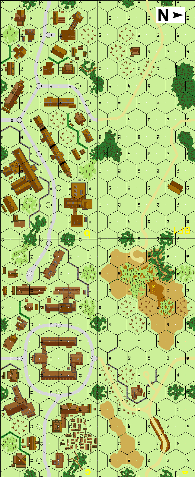 | Misc Rules: | All buildings are Wooden, single story, no hedges on Bd e |