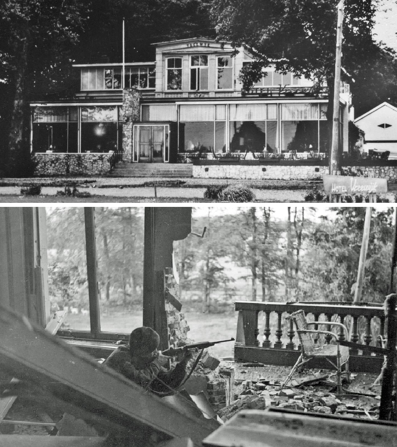 Lt. Colonel ‘Smitty’ Smyth and his Second-in-Command, major Peter Warr of B Company were ordered by Urquhart to take the tiny remnants of 10 Parachute Battalion, just 60 men, to the Utrechtseweg-Stationsweg road junction and occupy the handful of houses there, just east of both Main Dressing Stations. Lt. Glover and Lt. Saunders moved into a large building, a former restaurant, situated at the corner of a lane, Annastraat. A German AFV appeared and began to fire into the house occupied by Warr and Smyth. The officers retreated to Lt. Saunder’s building under cover of smoke and covering fire. German soldiers occupied the position that Warr and Smyth had abandoned, thus cutting Glover off, and proceeded to put a great deal of machine-gun fire down on his building, but the paras put an end to that by charging across the road and driving them out. The game of cat and mouse continued until the morning of Thursday 21st when the Germans made a determined attempt to remove the 10th Battalion from their positions.Attacker: British (10th Parachute Battalion, 1st Airborne Division)