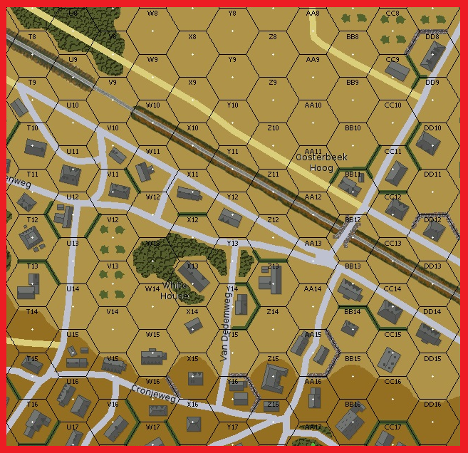 Thursday saw an increasing amount of pressure applied against the positions of the approximately 300 men remaining of the 7th KOSB, holding the Dreyeroord Hotel near the Oosterbeek Hoog Railway Station. This was the strongest point in the northern perimeter, and key to holding the sector. Through the day, snipers and the terrifying sound of Nebelwerfer mortars took their toll upon the inexperienced Scots of the Battalion. The Germans then launched a determined attack at 1630, directly through the hotel itself, and around it on both sides.......A tight "in yer face" battle with opposing forces 1 hex apart. Only for the tough and the brave.Attacker: German (SS) (SS Kampfgruppe Krafft)
