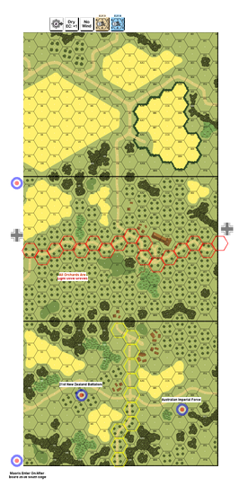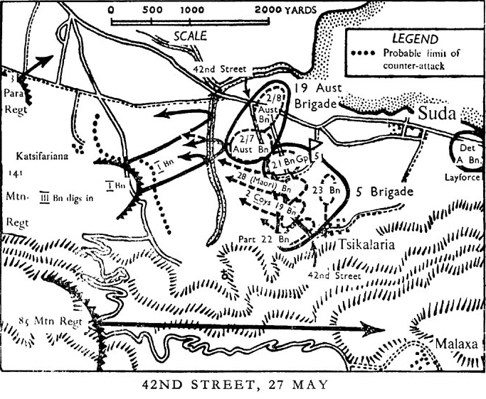 The success of the counterattack at Galatas on the 25th enabled the battered ANZACs to retire and form a defensive line in front of Suda Bay at 42nd Street, a dusty road running through the olive groves. Here the 19th Australian and the 5th new Zealand Brigades, each of their battalions now little more than company strength, dug in. The 2/7th Battalion spotted the advancing 1st Battalion, Gebirgsjager Regiment 141 first. While a small patrol kept them under observations, the rest of the battalion was sent forward. As they started to advance, the fierce Maoris of the neighboring 28th Battalion launched a wild charge.Attacker: Commonwealth (Australian/NZ) (2nd Australian Imperial Force | 21st NZ Battalion | 28th NZ Maoriš Battalion)