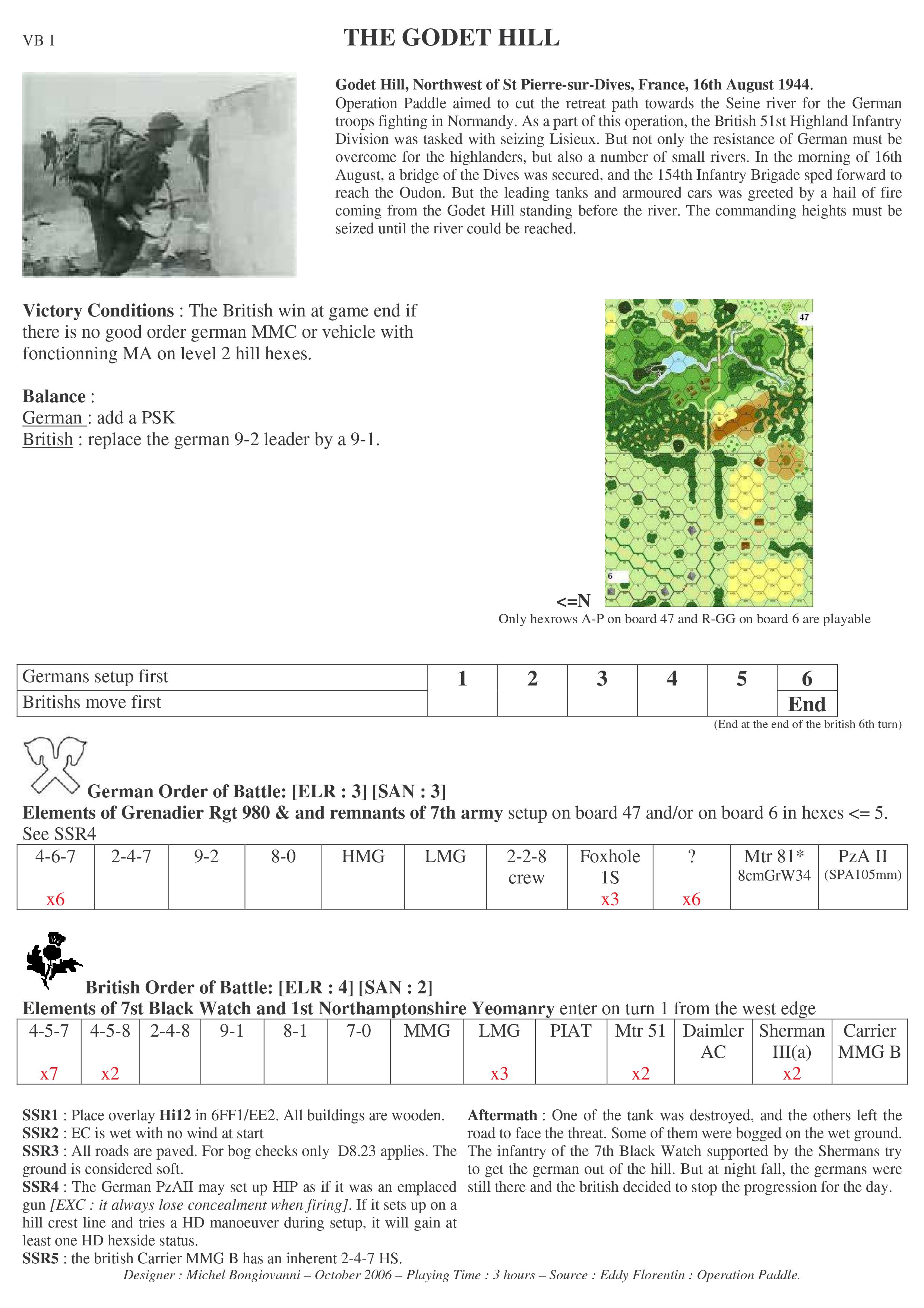 Operation Paddle aimed to cut the retreat path towards the Seine river for the German troops fighting in Normandy. As a part of this operation, the British 51st Highland Infantry Division was tasked with seizing Lisieux. But not only the resistance of German had to overcome, but also a number of small rivers. On the morning of 16th August, a bridge over the Dives was secured, and the 154th Infantry Brigade sped forward to reach the Oudon. But the leading tanks and armored cars were greeted by a hail of fire coming from Godet Hill standing before the river. The commanding heights had to be seized before the river could be reached.Attacker: British (7th Black Watch and 1st Northamptonshire Yeomanry)