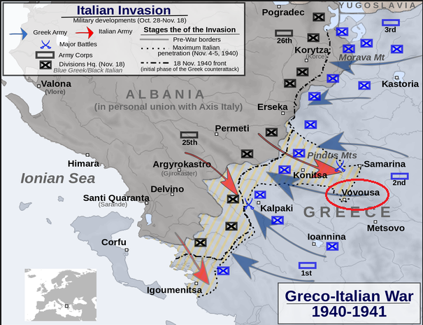 "Big Test" -- The Italian invasion of Greece began well enough, but it was no Blitzkrieg. The terrain was rough, and the Greek resistance tough. As the initial Italian advance slowed, the Greeks prepared to counterattack. Italian General Mario Girottiās light infantry and 3rd Alpine Division had proceeded as far south as Vovousa, and captured the village. The Greeks counterattacked there with their most elite formation, a detachment specially composed of one battalion of cavalry, and one battalion of artillery from the 51st Regiment. Led by the brave and able Colonel Davakis, they viciously launched themselves at the village.Attacker: Greek (Pindus Detachment, 51st Infantry Regiment)