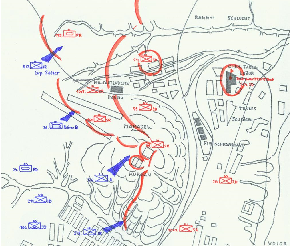 The Wehrmacht had advanced to within one hundred meters of the Volga, squeezing the Russians onto the river’s bank. One of the most dominant terrain features was a large grassy hill known as Mamayev Kurgan, 335 feet high, which commanded a fine view of the city center. The Germans had captured all but a small part of this hill by the 15th. At dawn on the 16th, after ferrying across the Volga as the Germans reinforced the hill, General Rodimtsev’s 42nd Guards counter-attacked in an effort to take the Mamayev Kurgan back.Attacker: German (Infanterie-Division 295)