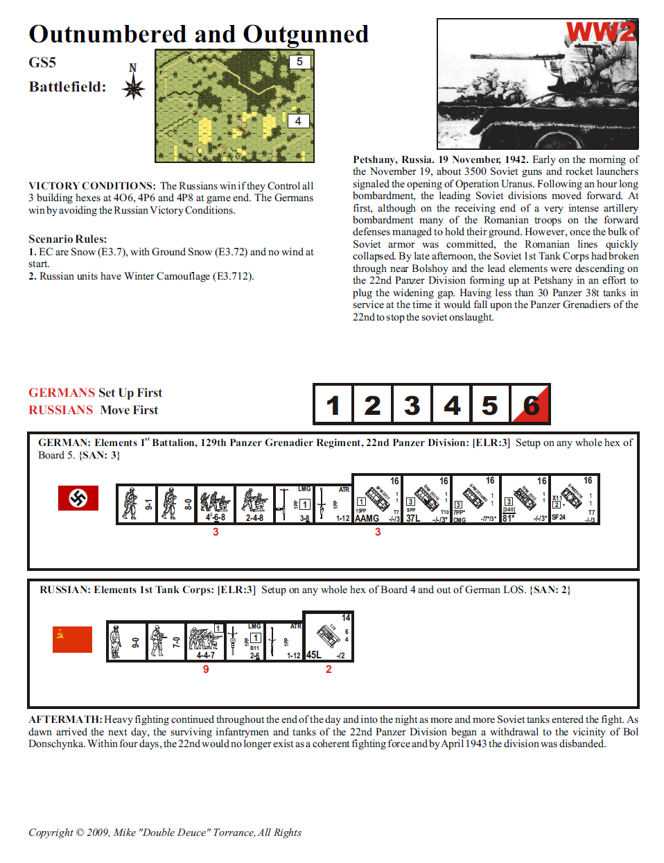 Early on the morning of the November 19, about 3500 Soviet guns and rocket launchers signaled the opening of Operation Uranus. Following an hour long bombardment, the leading Soviet divisions moved forward. At first, although on the receiving end of a very intense artillery bombardment many of the Romanian troops on the forward defenses managed to hold their ground. However, once the bulk of Soviet armor was committed, the Romanian lines quickly collapsed. By late afternoon, the Soviet 1st Tank Corps had broken through near Bolshoy and the lead elements were descending on the 22nd Panzer Division forming up at Petshany in an effort to plug the widening gap. Having less than 30 Panzer 38t tanks in service at the time it would fall upon the Panzer Grenadiers of the 22nd to stop the Soviet onslaught.Attacker: Russian (1st Tank Corps)