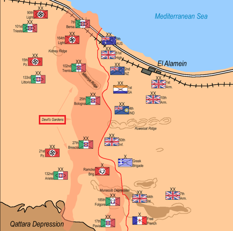 Rommel added depth to his defenses at El Alamein by creating two belts of mines which were connected at intervals to create boxes which would restrict enemy penetration. The main defensive positions were built to a depth of at least 2 kilometer behind the second mine belt. These belts became known as Teufelgarten (Devil's Garden). On the night of 24 October, the British began to move through the belts against Italian defenders.Attacker: British (51st Highland Division and 1st Armoured Division)