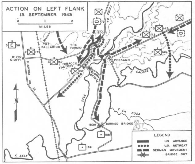 To fulfill General Dawley's request to close the gap between the Sele-Calore Rivers, General Walker sent his divisional reserve to plug the hole. The 2nd Battalion, 143rd Infantry Regiment was deployed to cover the frontage with the company's HQ in the small village of Persano, two companies in reserve and G Company to the east. They failed to dig in properly and the defenses were not inspected. This lax behavior would soon be punished, as less than an hour after settling in, F Company reported hearing tank noises to the front and left. These Germans, which had defeated the 157th Regiment's 1st Battalion on the opposite bank, barreled into the American positions firing from halftracks and tanks.
