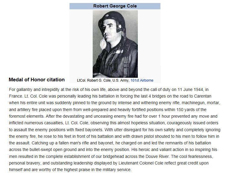 In an effort to link up with the 29th Infantry Division, Lt. Robert Cole’s 3rd Battalion, 502nd Parachute Infantry Regiment was assigned to capture Hill 30 at the south-east edge of Carentan. The men of “I” Company led the way, moving out over the elevated causeway under enemy sniper and machine-gun fire. Beyond the last bridge was a farmhouse, dominating a large, open field. During the morning 84 men of “H” Company passed through and took on German troops arrayed around a CP established in the farmhouse. Enemy fire held off the paratroopers, wounding and killing a number of Americans. Cole, meanwhile, paced back and forth, finally passing word down the line, “Fix bayonets and prepare to charge the farmhouse upon a blast of a whistle.”Attacker: American (502nd Parachute Infantry Regiment)