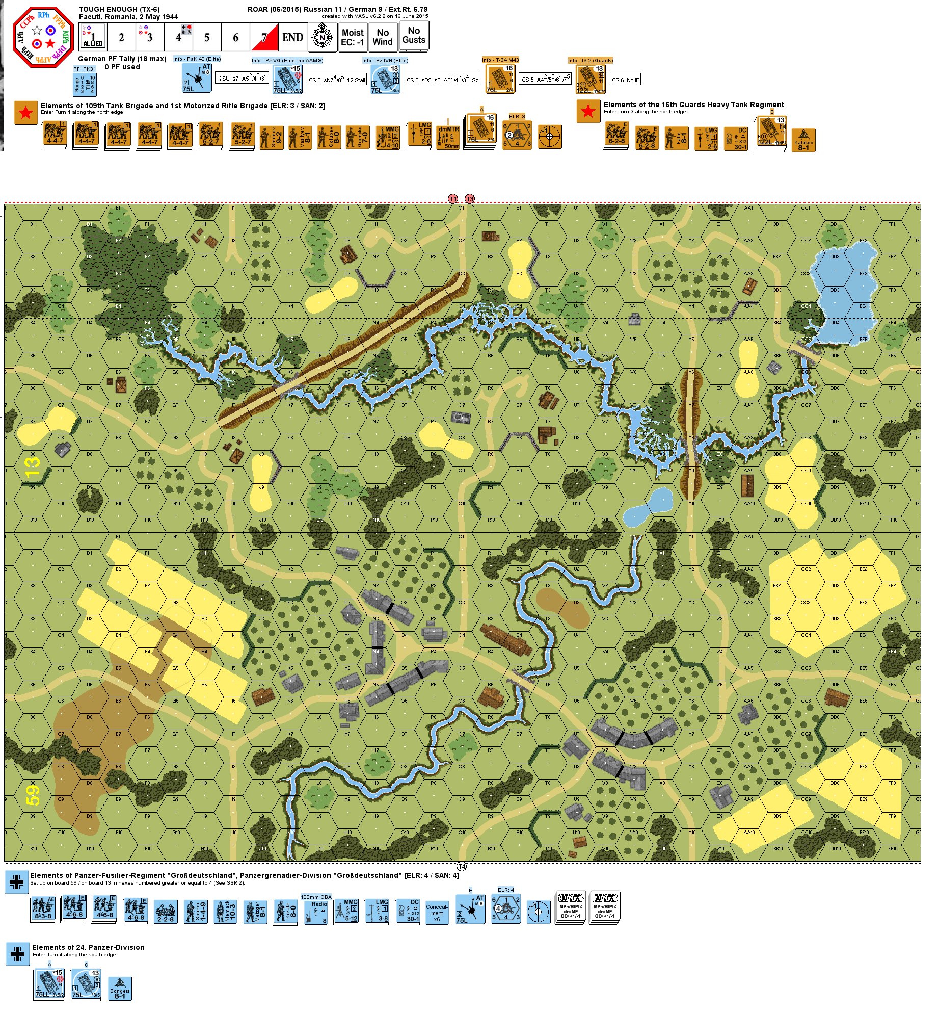 Spring of 1944 found the Red Army juggernaught in the foothills of the Carpathians and all of Germany's allies in Eastern Europe were now in danger. The ebb of the rasputitsa made mechanized operations possible and on April 25th, Konev's 2nd Tank Army moved across the Romanian border with the objective of Iassy. German and Romanian forces defended well enough to buy time for their own armored reserves to move into position around the town of Targul Frumos. There, the Panzergrenadier Division Großdeustschland met Konev's tanks in the mud of May's thaw.Attacker: Russian (Elements of 109th Tank Brigade and 1st Motorized Rifle Brigade / Elements of the 16th Guards Heavy Tank Regiment)