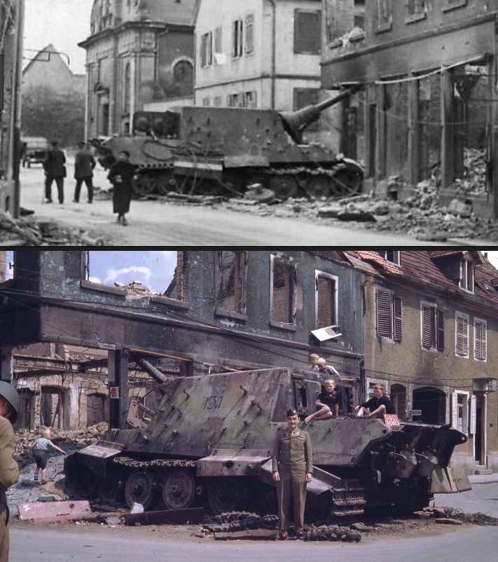 The German First Army High Command needed to establish a new front line running from Gorssachsen-Schreisheim-Ladenberg-Neckar Cannal to Seckenheim-Altrip-Rhein. For this operation the First Army would receive the 559th Volksgrenadier Division and attached to it the 653rd Schewere Panzerjager Abteilung with eight operational Jagdtigers. The morning of 30 March, three Jagdtigers of the Kompanie 1 under command of Leutnant Hans Knippenberg were ordered into combat at Heidelberg / Schwetzingen, to delay the American advance from Mannheim. The heavy tank destroyers arrived in Schwetzingen just before noon. The American spearhead reached the city earlier than anticipated and immediately engaged the huge tank destroyers in combat.Attacker: American (Combat Command R)