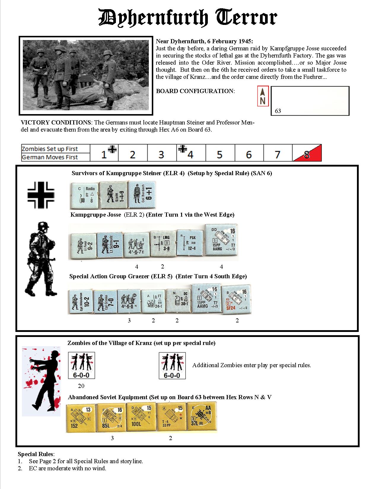 | Misc Rules: | Zombie SSR; see PDF below. A: FTV2 w D: Soviet AFVs may be used as shelters from Zombies |
