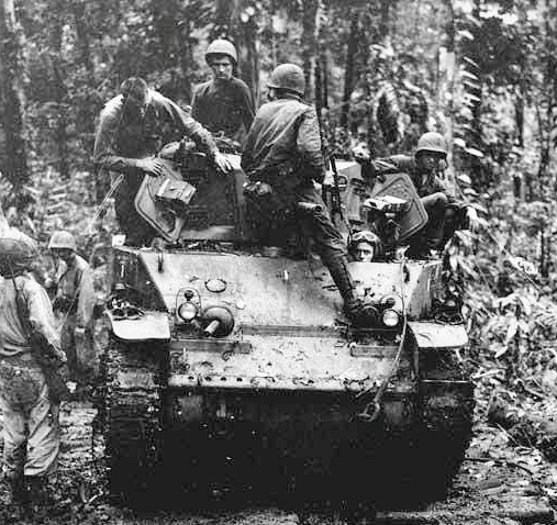 By early July, one of the remaining pockets of Japanese resistance on Saipan was in the vicinity of Paradise Valley, facing the U.S. 27th Division. The main access point to the valley was a deep draw, which was nicknamed ‘Harakiri Gulch’ after some 60 Japanese soldiers were found dead, inexplicably by their own hands. With several attacks thrown back by Japanese hidden in caves on the sides of the gulch, Col. Bishop decided to send two companies of infantry over the high ground to flank the Japanese positions, which now included a disabled US tank stuck in the gulch. Light tanks would be brought up in support.Attacker: American (Elements of 136th Infantry Regiment)
