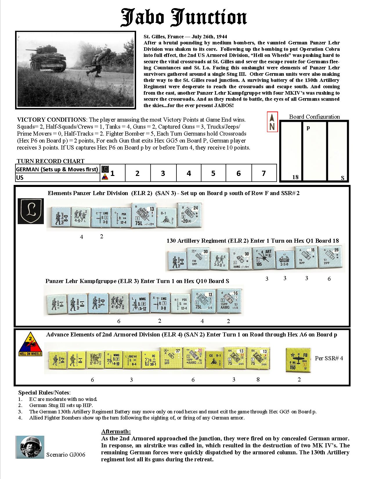 After a brutal pounding by medium bombers, the vaunted German Panzer Lehr Division was shaken to its core. Following up the bombing to put Operation Cobra into full effect, the 2nd US Armored Division, “Hell on Wheels”, was pushing hard to secure the vital crossroads at St. Gilles and sever the escape route for Germans fleeing Countances and St. Lo. Facing this onslaught were elements of Panzer Lehr survivors gathered around a single StuG III. Other German units were also making their way to the St. Gilles road junction. A surviving battery of the 130th Artillery were desperate to reach the crossroads and escape south. And coming in from the east, another Panzer Lehr Kampfgruppe with four MKIV’s was rushing to secure the crossroads. And as they rushed into battle, the eyes of all Germans scanned the skies. . . for the ever present JABOS!Attacker: German (Panzer Lehr Division and 130th Artillery Regiment)