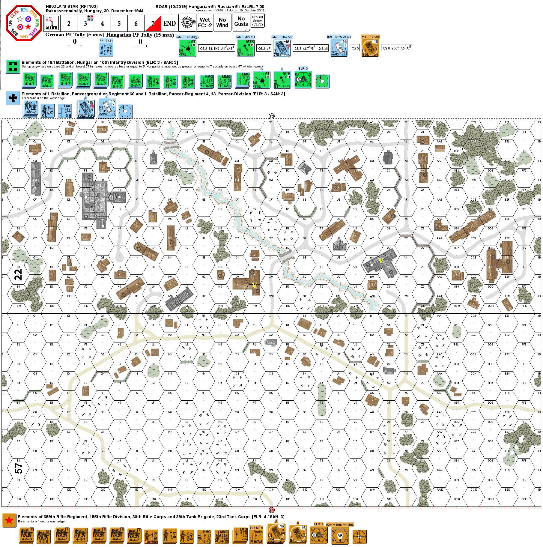 Hero of the Soviet Union, Captain Nikolai L. Nikolaichuk (10-3) leads the 659th Rifle Regiment supported by tanks and OBA in an attack against Hungarian and German units. . .(Historic recount from "Battle of Budapest: 100 Days in World War II": "On the morning of 30 December, the Pest front lay east of a semicircular line that bulged along the edge of the suburbs of Rakospalota, Rakosszentmihaly, Matayasfold and Soroksar. During that day, the Soviet offensive gained a significant amount of ground in the eastern and southern sectors, where the front of the Hungarian 12th Reserve Division was repeatedly overrun and the Hungarian 10th Infantry Division, with only three fighting battalions left, found itself in a critical situation. Soviet infantry supported by tanks stormed across the fields bordering the Szilas stream west of Matyasfold, continuing the attack. The Hungarian 18/I Battalion took up new positions alongside the detached houses in Rakosszentmihaly, but by evening had been practically annihilated near the local church, although the Soviets also suffered significant losses. A group of Soviet soldiers who had advanced as far as the church were encircled as a result of German and Hungarian counter-strikes, and could break out only after asking their own artillery to fire at them and continuously adjusting the direction of fire as the battle progressed. Captain Nikolaichuk was awarded the Hero of the Soviet Union medal for organizing this action.")Attacker: Russian (659th Rifle Regiment with armor support)