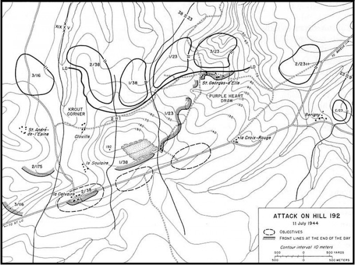 As part of the major offensive of 11 July, First Army ordered V Corps to attack and seize the dominating terrain east of Saint-Lo. General Gerow ordered the 2d Division to once again attack and seize Hill 192. General Robertson ordered the 38th Infantry to conduct the main attack. This time, the regimental commander decided to conduct a powerful frontal assault with two battalions abreast. The attack started at 0630 on 11 July after a devastating twenty-minute artillery bombardment. The 1st and 2nd Battalions led the attack, supported by two tank companies from the 741st Tank Battalion and an engineer company from the 2d Engineer Combat Battalion. The Germans put up stiff resistance from the beginning. One tank company lost six Shermans to German panzerfausts. Fanatical Germans defending a position near "Kraut Corner" refused to surrender and were run over and buried alive by one of the 741st's dozer tanks. However, the 38th Infantry began to make good progress by using its new hedgerow tactics. Devastating artillery fire closely supported the infantry advance by maintaining heavy barrages in front of the attacking units. Around noon, the 38th Infantry finally reached the top of Hill 192 as the Germans disengaged and withdrew to the south. By nightfall, the 38th Infantry had cleared Hill 192 of all German defenders and was well entrenched in positions on the hill's southern slopes.Attacker: American (A+C Companies, 1st Battalion, 23rd Regiment, 2nd Division and Company C. 741st Tank Battalion)