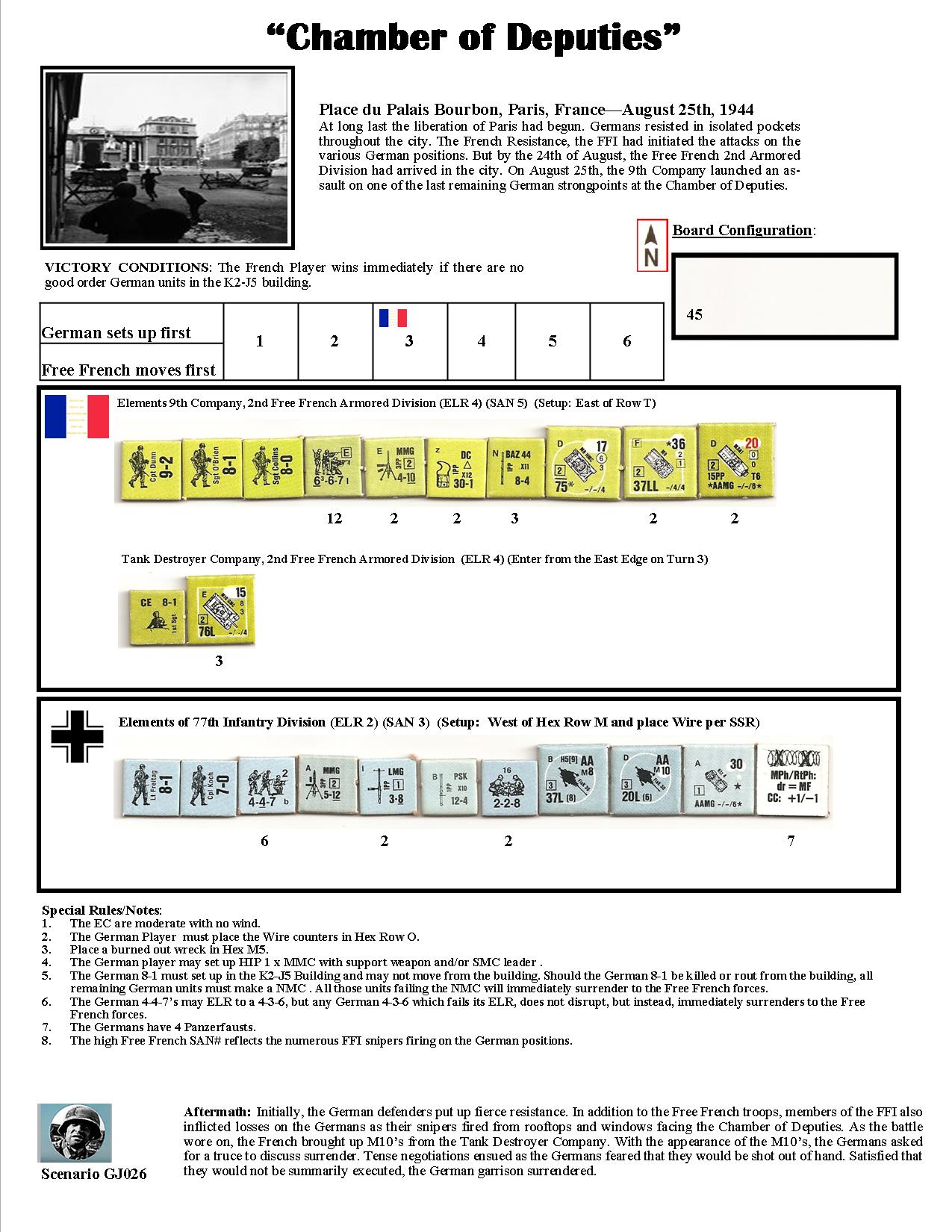 At long last, the liberation of Paris had begun. Germans resisted in isolated pockets throughout the city. The French Resistance, the FFI, had initiated the attacks on the various German positions. But by the 24th of August, the Free French 2nd Armored Division had arrived in the city. On August 25th, the 9th Company launched an assault on one of the last remaining German strongpoints at the Chamber of Deputies.Attacker: Free French (9th Company, 2nd Free French Armored Division)