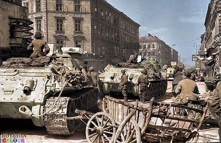 Soviet SU-100 Tank Destroyers roll into the Austrian capital of Vienna, April 1945
