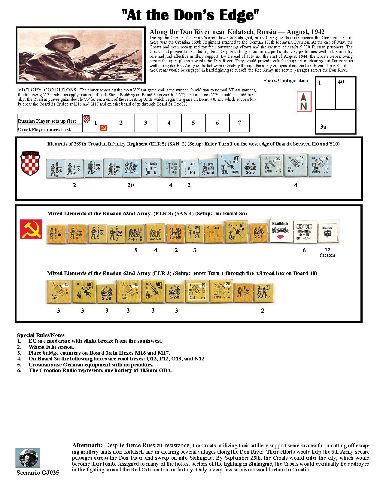 During the German 6th Army’s drive towards Stalingrad, many foreign units accompanied the Germans. One of these was the Croatian 369th Regiment attached to the German 100th Mountain Division. At the end of May, the Croats had been recognized for their outstanding efforts and the capture of nearly 5,000 Russian prisoners. The Croats had proven to be solid fighters. Despite lacking in armor support units, they performed well in the infantry role and had effective artillery support. By the end of July and the start of August, 1944, the Croats were moving across the open plains towards the Don River. They would provide valuable support in clearing out Partisans as well as regular Red Army units that were retreating through the many villages along the Don River. Near Kalatsch, the Croats would be engaged in hard fighting to cut off the Red Army and secure passages across the Don River.Attacker: Croatian (369th Croatian Infantry Regiment)