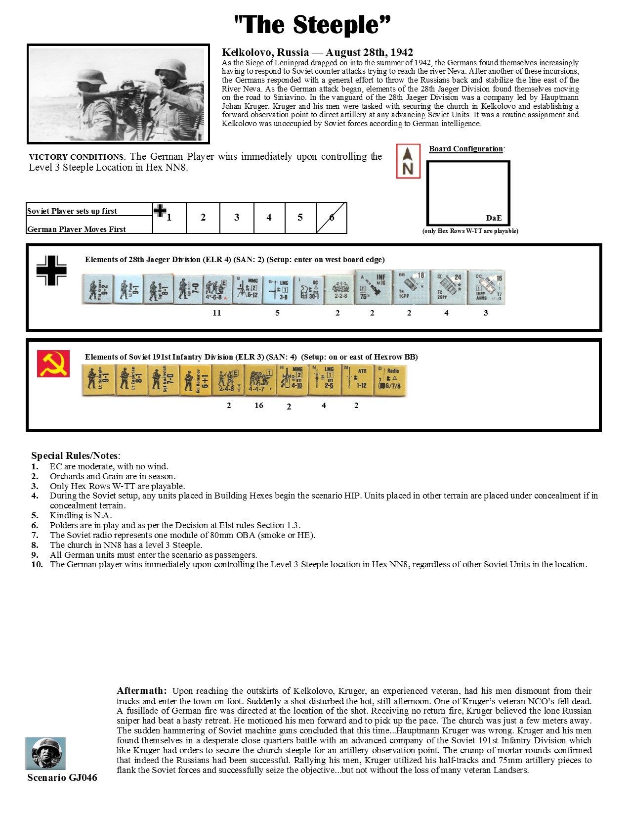 As the Siege of Leningrad dragged on into the summer of 1942, the Germans found themselves increasingly having to respond to Soviet counter-attacks trying to reach the river Neva. After another of these incursions, the Germans responded with a general effort to throw the Russians back and stabilize the line east of the River Neva. As the German attack began, elements of the 28th Jaeger Division found themselves moving on the road to Siniavino. In the vanguard of the 28th Jaeger Division was a company led by Hauptmann Johan Kruger. Kruger and his men were tasked with securing the church in Kelkolovo and establishing a forward observation point to direct artillery at any advancing Soviet units. It was a routine assignment and Kelkolovo was unoccupied by Soviet forces according to German intelligence. Upon reaching the outskirts of Kelkolovo, Kruger, an experienced veteran, had his men dismount from their trucks and enter the town on foot. Suddenly a shot disturbed the hot, still afternoon. One of Kruger’s veteran NCO’s fell dead. A fusillade of German fire was directed at the location of the shot. Receiving no return fire, Kruger believed the lone Russian sniper had beat a hasty retreat. He motioned his men forward and to pick up the pace. The church was just a few meters away. The sudden hammering of Soviet machine guns concluded that this time...Hauptmann Kruger was wrong.Attacker: German (28th Jaeger Division)