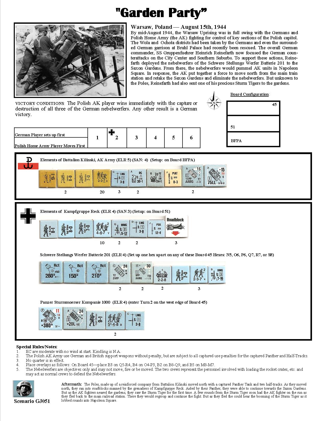 By mid-August 1944, the Warsaw Uprising was in full swing with the Germans and Polish Home Army (the AK) fighting for control of key sections of the Polish capitol. The Wola and Ochota districts had been taken by the Germans and even the surrounded German garrison at Bruhl Palace had recently been rescued. The overall German commander, SS Gruppenfuehrer Heinrich Reinefarth now focused the German counterattacks on the City Center and Southern Suburbs. To support these actions, Reinefarth deployed the nebelwerfers of the Schwere Stellungs Werfer Batterie 201 to the Saxon Gardens. From there, the nebelwerfers would pummel AK units in Napoleon Square. In response, the AK put together a force to move north from the main train station and retake the Saxon Gardens and eliminate the nebelwerfers. But unknown to the Poles, Reinefarth had also sent one of his precious Sturm Tigers to the gardens.