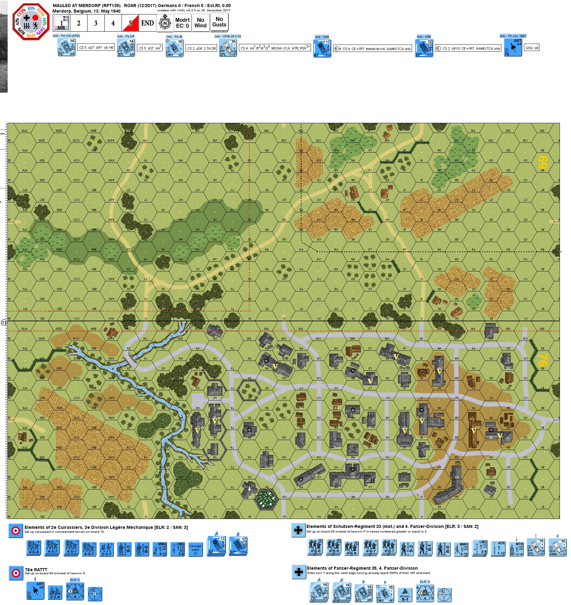 Merdop was key to the German's southern flank as they pushed past Hannut. The German panzers and motorized riflemen were repulsed in heavy fighting, largely due to the Cuirassiers and dragoons being supported by a tremendous artillery barrage. This spurred the Germans to send their panzers west to overrun the exposed French artillery. Without panzer support, S35s attacked from Merdop and mauled the landsers, forcing a hasty return of the panzers. While the S35s and panzers dueled, the German infantry infiltrated the town.Attacker: German (Elements of Schutzen-Regiment 33 (mot.) and 4. Panzer-Division and Panzer-Regiment 35, 4. Panzer Division)