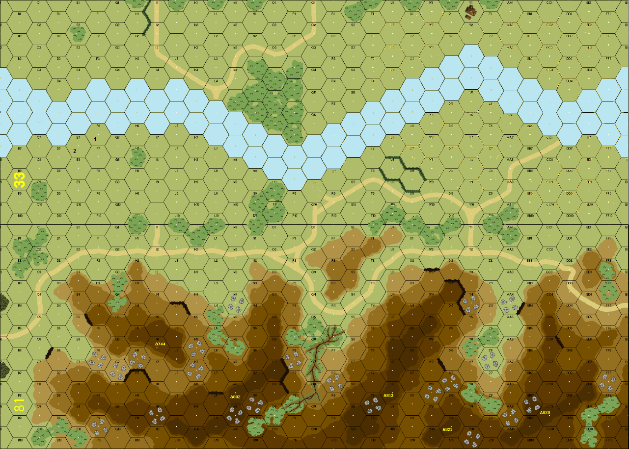 | Misc Rules: | Night rules. KW Terrain (Exc: Woods / Orchards are Brush). Roads are Paths. No Grain. Shallow river |