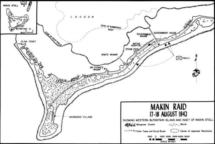 As Col. Carlson’s Raider detachment teams approached the HQ compound in the pre-dawn hours, firing was heard from their fellow Marines at the Seaplane anchorage and docks. The gunfire awoke the Japanese, and they began to form up and gather equipment to send a patrol to investigate. Seeing the chance of surprise slip away, Col. Carlson gave the order “Charge!” All teams began rushing the surprised and shocked Japanese men in the compound, SMGs firing at the hip and Grenades exploding as they arched through the air. The Battle was onAttacker: American (USMC) (Detachment 1, 2nd Marine Raider Battalion)