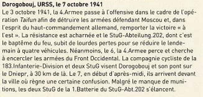 "A Nail in the Coffin"-- On October 3, 1941, 4.Armee went on the offensive as part of Operation Typhoon to destroy the armies defending Moscow and, in the hopes of German high command, win victory in the summer. The resistance was fierce and StuG-Abteilung 202, in a baptism of fire, suffered heavy losses and was reduced the following day to four vehicles. Nevertheless, on the 6th, the 4.Armee pierced and sought to encircle the armies of the Western Front. The bicycle company of the 183.Iinfanterie-Division and two StuG aimed at Dorogobouj and the Dniepr River, 30 kilometers away. On the 7th, in the early afternoon, they arrived in front of the city where there was some confusion. Despite the lack of ammunition, both StuGs of 1. Batterie StuG-Abteilung 202 went on the attack.Attacker: German (Radfahrschwadron, 183.Infanterie-Division and Sturmgeschutz-Abteilung.202)