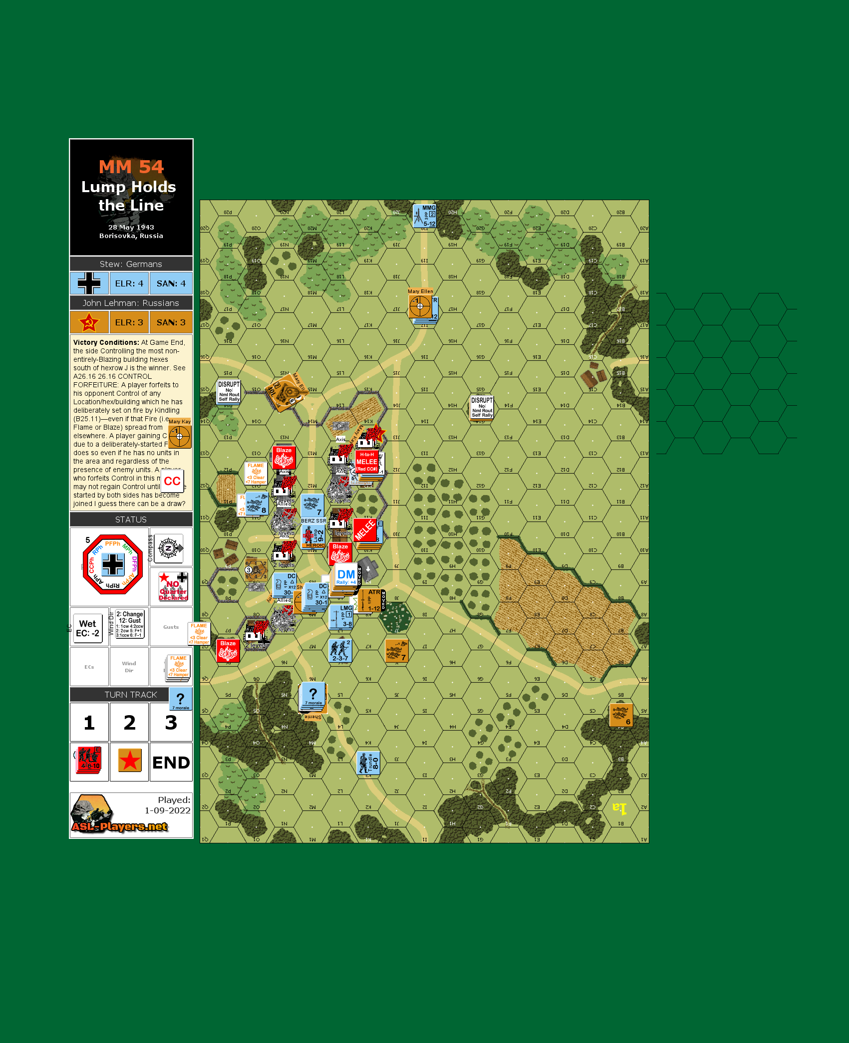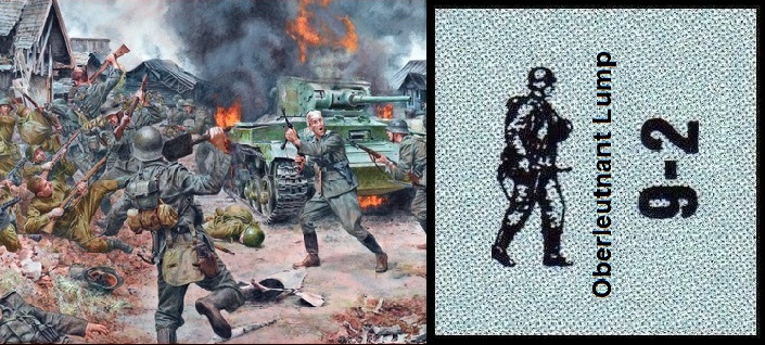 The action depicted in the scenario takes place on May 28th, 1943 near Borisovka. Through this area ran what the Germans called "The Blue Line" after the pencil color used to denote this particular defensive line. The Russians were constantly probing this line and trying to break-through. At Borisovka, they had nearly succeeded in breaching the German lines. A heavy bombardment had set many of the wooden buildings on fire and had eliminated a great many of the German defenders. Supported by 4 lend lease Valentine tanks, the Soviets pushed forward to take the entire village. Only a fanatic charge of Germans led by Oberleutnant Karl-Will Lump managed to stop the Soviets and take back the village.Attacker: German (Grenadier Regiment 226, Infantry Division 79)