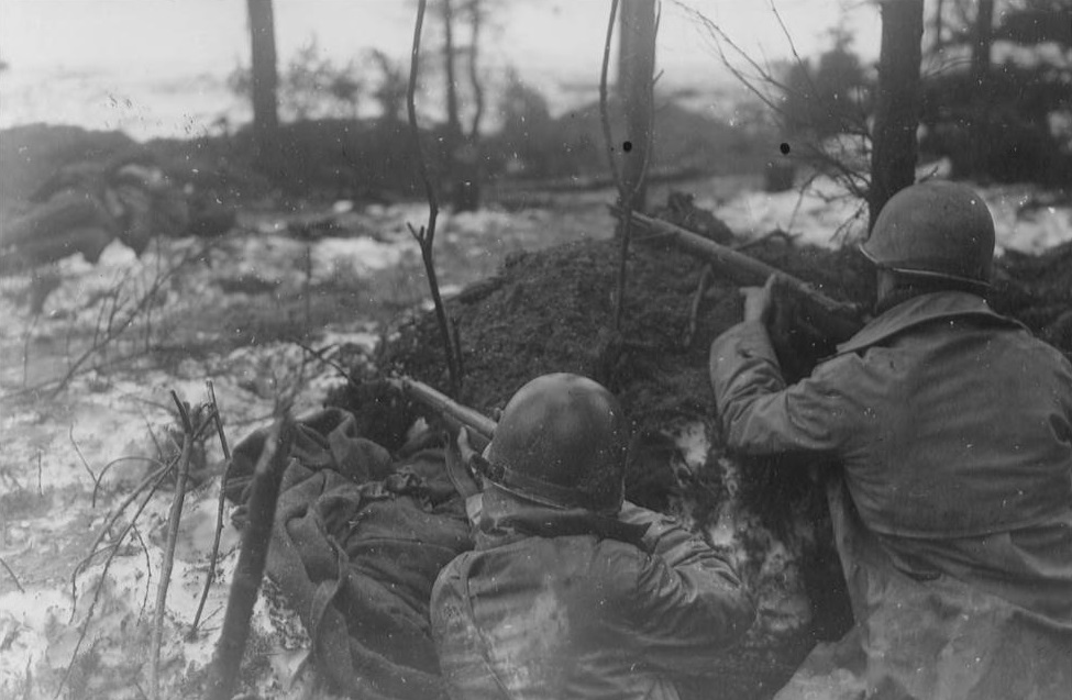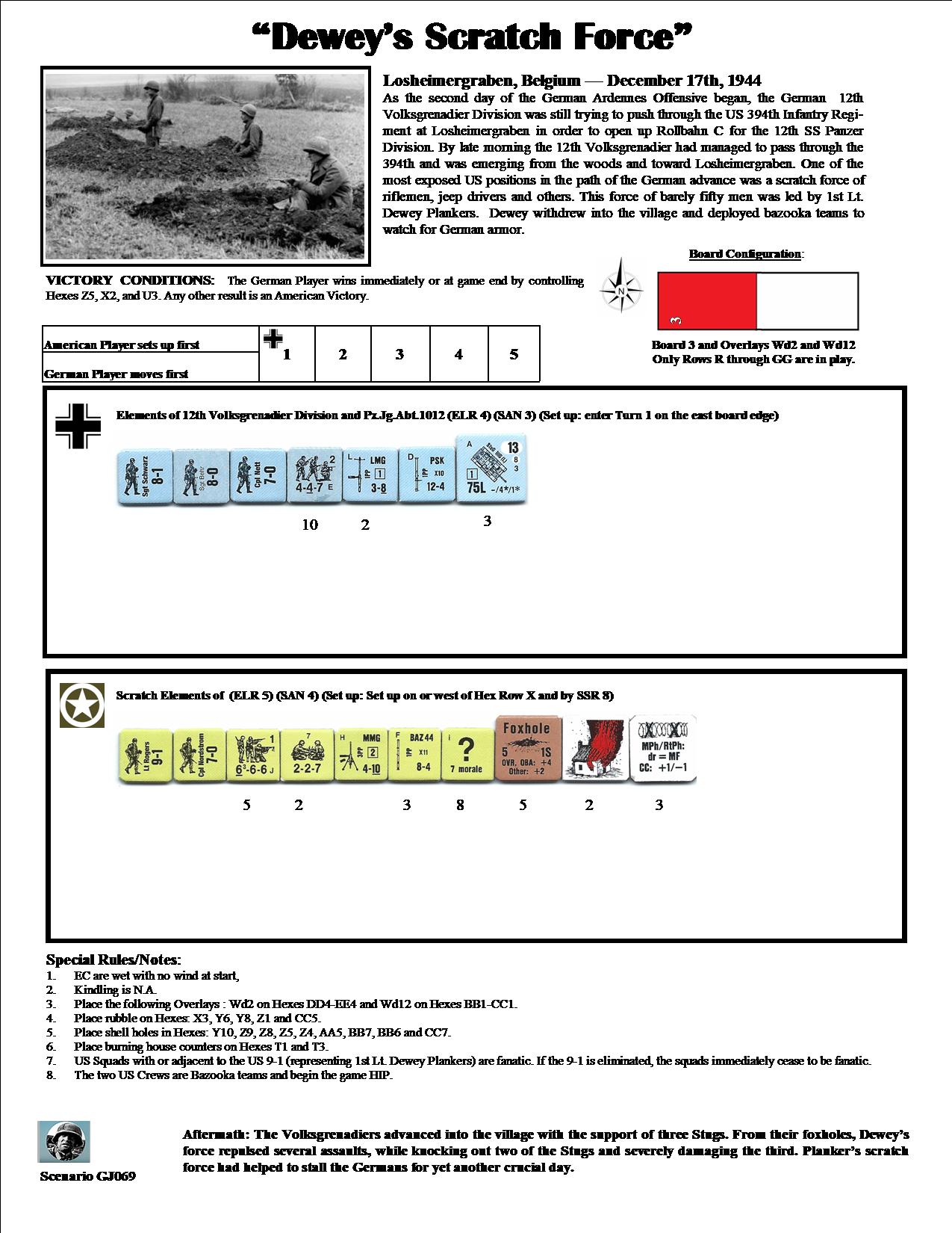 As the second day of the German Ardennes offensive began, the German 12th Volksgrenadier Division was still trying to push through the U.S. 394th Infantry Regiment at Losheimergraben in order to open up Rollbahn C for the 12th SS Panzer Division. By late morning, the 12th Volksgrenadier had managed to pass through the 294th and was emerging from the woods and toward Losheimergraben. One of the most exposed U.S. positions in the path of the German advance was a scratch force of riflemen, jeep drivers and others. This force of barely fifty men was led by 1st Lt. Dewey Plankers. Dewey withdrew into the village and deployed bazooka teams to watch for German armor. Soon the Voksgrenadiers advanced into the village with the support of three StuGs.Attacker: German (12th Volksgrenadier Division and Pz.Jg.Abt.1012)